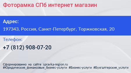 Фоторамка.СПб, интернет-магазин по адресу 197343, Россия, Санкт-Петербург, Торжковская, 20 в дальнейшем Организация, размещена в следующих категориях: