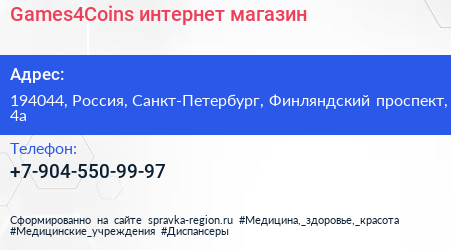 Games4Coins, интернет-магазин по адресу 194044, Россия, Санкт-Петербург, Финляндский проспект, 4а в дальнейшем Организация, размещена в следующих категориях: