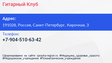 Гитарный Клуб по адресу 191028, Россия, Санкт-Петербург, Кирочная, 3 в дальнейшем Организация, размещена в следующих категориях: