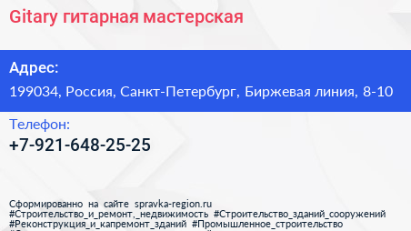 Gitary, гитарная мастерская по адресу 199034, Россия, Санкт-Петербург, Биржевая линия, 8-10 в дальнейшем Организация, размещена в следующих категориях:
