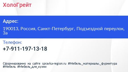 ХолоГрейт по адресу 190013, Россия, Санкт-Петербург, Подъездной переулок, 3а в дальнейшем Организация, размещена в следующих категориях: