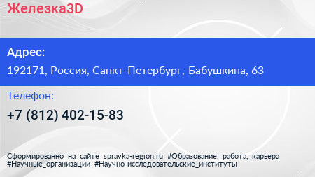 Железка3D по адресу 192171, Россия, Санкт-Петербург, Бабушкина, 63 в дальнейшем Организация, размещена в следующих категориях: