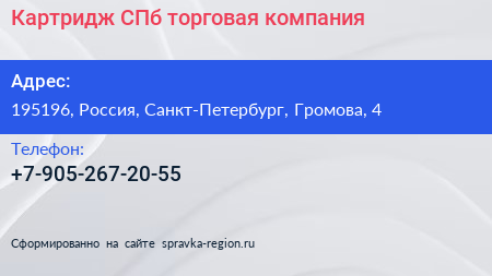 Картридж СПб, торговая компания по адресу 195196, Россия, Санкт-Петербург, Громова, 4 в дальнейшем Организация, размещена в следующих категориях: