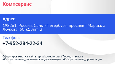 Компсервис по адресу 198261, Россия, Санкт-Петербург, проспект Маршала Жукова, 60 к1 лит В в дальнейшем Организация, размещена в следующих категориях: