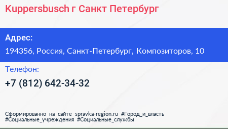 Kuppersbusch, г. Санкт-Петербург по адресу 194356, Россия, Санкт-Петербург, Композиторов, 10 в дальнейшем Организация, размещена в следующих категориях: