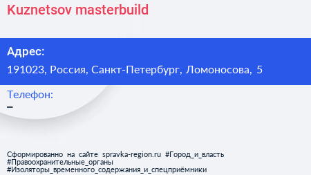 Kuznetsov masterbuild по адресу 191023, Россия, Санкт-Петербург, Ломоносова, 5 в дальнейшем Организация, размещена в следующих категориях: