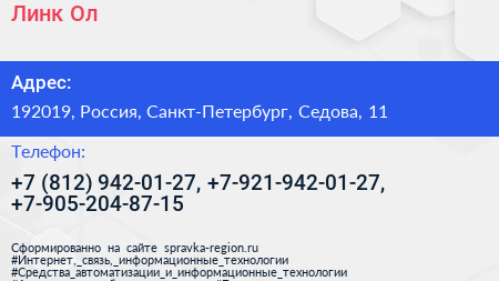 Линк-Ол по адресу 192019, Россия, Санкт-Петербург, Седова, 11 в дальнейшем Организация, размещена в следующих категориях: