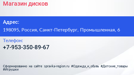 Магазин дисков по адресу 198095, Россия, Санкт-Петербург, Промышленная, 6 в дальнейшем Организация, размещена в следующих категориях: