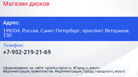 Магазин дисков по адресу 198334, Россия, Санкт-Петербург, проспект Ветеранов, 130 в дальнейшем Организация, размещена в следующих категориях: