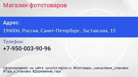 Магазин фототоваров по адресу 196006, Россия, Санкт-Петербург, Заставская, 15 в дальнейшем Организация, размещена в следующих категориях: