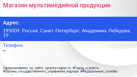 Магазин мультимедийной продукции по адресу 195009, Россия, Санкт-Петербург, Академика Лебедева, 19 в дальнейшем Организация, размещена в следующих категориях: