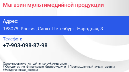 Магазин мультимедийной продукции по адресу 193079, Россия, Санкт-Петербург, Народная, 3 в дальнейшем Организация, размещена в следующих категориях:
