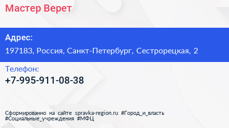 Мастер Верет по адресу 197183, Россия, Санкт-Петербург, Сестрорецкая, 2 в дальнейшем Организация, размещена в следующих категориях: