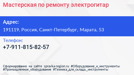 Мастерская по ремонту электрогитар по адресу 191119, Россия, Санкт-Петербург, Марата, 53 в дальнейшем Организация, размещена в следующих категориях: