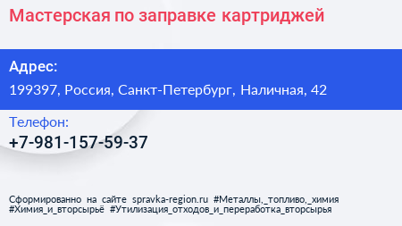 Мастерская по заправке картриджей по адресу 199397, Россия, Санкт-Петербург, Наличная, 42 в дальнейшем Организация, размещена в следующих категориях: