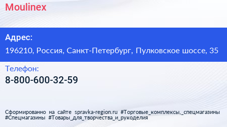 Moulinex по адресу 196210, Россия, Санкт-Петербург, Пулковское шоссе, 35 в дальнейшем Организация, размещена в следующих категориях:
