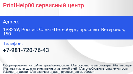 PrintHelp00, сервисный центр по адресу 198259, Россия, Санкт-Петербург, проспект Ветеранов, 150 в дальнейшем Организация, размещена в следующих категориях:
