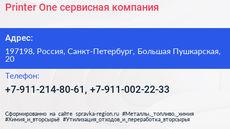 Printer-One, сервисная компания по адресу 197198, Россия, Санкт-Петербург, Большая Пушкарская, 20 в дальнейшем Организация, размещена в следующих категориях: