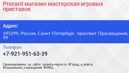 Procard, магазин-мастерская игровых приставок по адресу 195299, Россия, Санкт-Петербург, проспект Просвещения, 99 в дальнейшем Организация, размещена в следующих категориях: