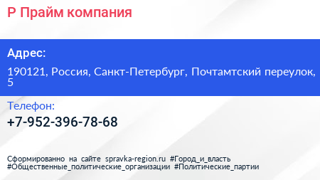 Р-Прайм, компания по адресу 190121, Россия, Санкт-Петербург, Почтамтский переулок, 5 в дальнейшем Организация, размещена в следующих категориях: