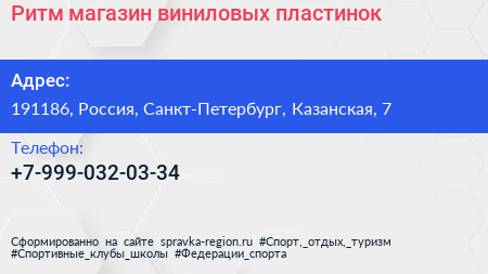 Ритм, магазин виниловых пластинок по адресу 191186, Россия, Санкт-Петербург, Казанская, 7 в дальнейшем Организация, размещена в следующих категориях: