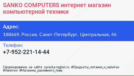 SANKO COMPUTERS, интернет-магазин компьютерной техники по адресу 188669, Россия, Санкт-Петербург, Центральная, 46 в дальнейшем Организация, размещена в следующих категориях: