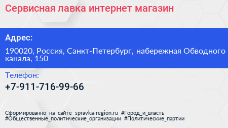 Сервисная лавка, интернет-магазин по адресу 190020, Россия, Санкт-Петербург, набережная Обводного канала, 150 в дальнейшем Организация, размещена в следующих категориях: