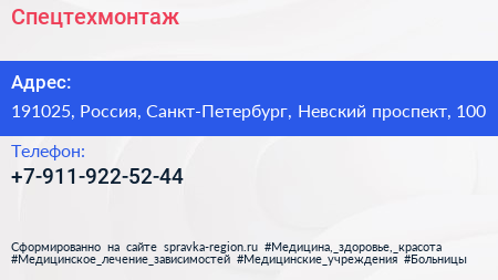 Спецтехмонтаж по адресу 191025, Россия, Санкт-Петербург, Невский проспект, 100 в дальнейшем Организация, размещена в следующих категориях:
