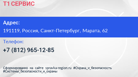 Т1 СЕРВИС по адресу 191119, Россия, Санкт-Петербург, Марата, 62 в дальнейшем Организация, размещена в следующих категориях: