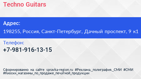 Techno Guitars по адресу 198255, Россия, Санкт-Петербург, Дачный проспект, 9 к1 в дальнейшем Организация, размещена в следующих категориях: