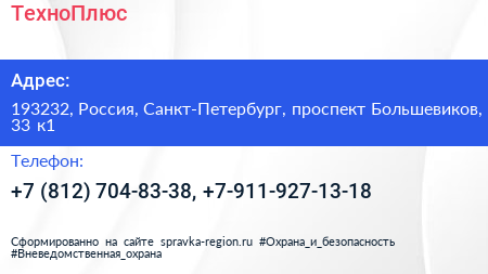 ТехноПлюс по адресу 193232, Россия, Санкт-Петербург, проспект Большевиков, 33 к1 в дальнейшем Организация, размещена в следующих категориях: