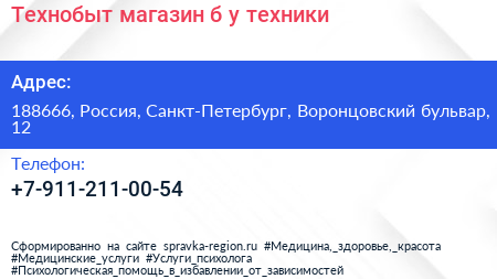 Технобыт, магазин б/у техники по адресу 188666, Россия, Санкт-Петербург, Воронцовский бульвар, 12 в дальнейшем Организация, размещена в следующих категориях: