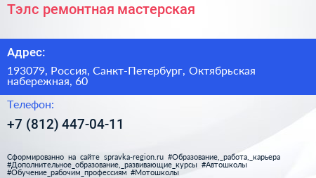 Тэлс, ремонтная мастерская по адресу 193079, Россия, Санкт-Петербург, Октябрьская набережная, 60 в дальнейшем Организация, размещена в следующих категориях: