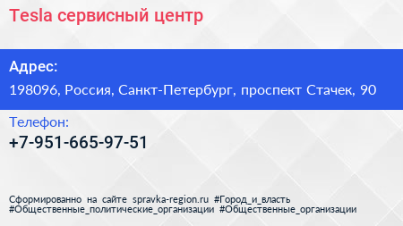 Tesla, сервисный центр по адресу 198096, Россия, Санкт-Петербург, проспект Стачек, 90 в дальнейшем Организация, размещена в следующих категориях: