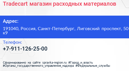 Tradecart, магазин расходных материалов по адресу 191040, Россия, Санкт-Петербург, Лиговский проспект, 50 к9 в дальнейшем Организация, размещена в следующих категориях: