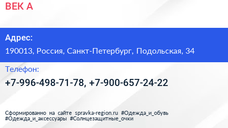ВЕК-А по адресу 190013, Россия, Санкт-Петербург, Подольская, 34 в дальнейшем Организация, размещена в следующих категориях: