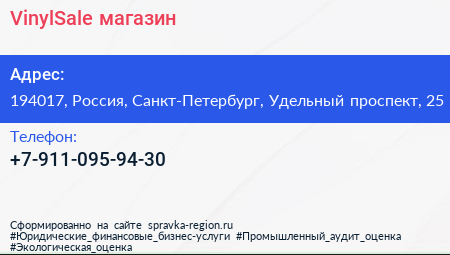 VinylSale, магазин по адресу 194017, Россия, Санкт-Петербург, Удельный проспект, 25 в дальнейшем Организация, размещена в следующих категориях: