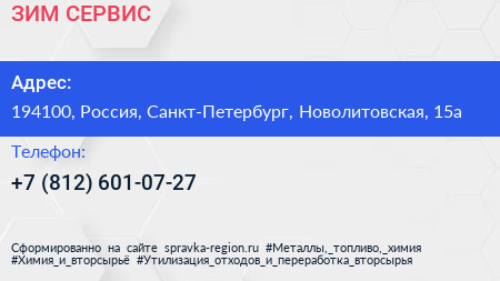 ЗИМ-СЕРВИС по адресу 194100, Россия, Санкт-Петербург, Новолитовская, 15а в дальнейшем Организация, размещена в следующих категориях: