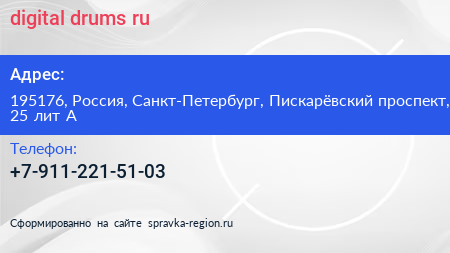 digital-drums.ru по адресу 195176, Россия, Санкт-Петербург, Пискарёвский проспект, 25 лит А в дальнейшем Организация, размещена в следующих категориях: