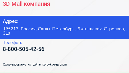 3D Mall, компания по адресу 195213, Россия, Санкт-Петербург, Латышских Стрелков, 31а в дальнейшем Организация, размещена в следующих категориях: