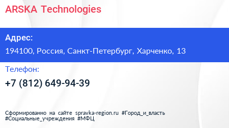 ARSKA Technologies по адресу 194100, Россия, Санкт-Петербург, Харченко, 13 в дальнейшем Организация, размещена в следующих категориях: