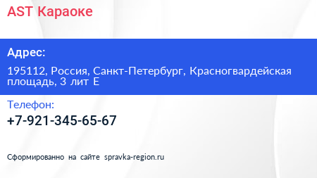 AST Караоке по адресу 195112, Россия, Санкт-Петербург, Красногвардейская площадь, 3 лит Е в дальнейшем Организация, размещена в следующих категориях: