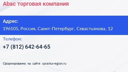 Abac, торговая компания по адресу 196105, Россия, Санкт-Петербург, Севастьянова, 12 в дальнейшем Организация, размещена в следующих категориях: