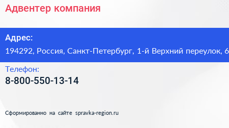 Адвентер, компания по адресу 194292, Россия, Санкт-Петербург, 1-й Верхний переулок, 6 в дальнейшем Организация, размещена в следующих категориях:
