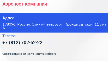 Аэропост, компания по адресу 198096, Россия, Санкт-Петербург, Кронштадтская, 11 лит А в дальнейшем Организация, размещена в следующих категориях: