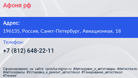 Афоня.рф по адресу 196135, Россия, Санкт-Петербург, Авиационная, 18 в дальнейшем Организация, размещена в следующих категориях: