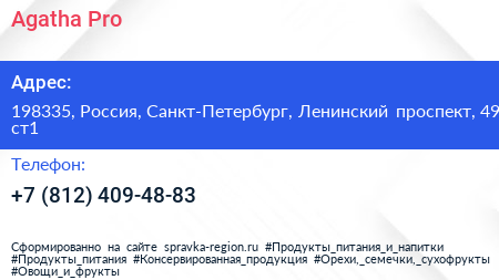 Agatha Pro по адресу 198335, Россия, Санкт-Петербург, Ленинский проспект, 49 ст1 в дальнейшем Организация, размещена в следующих категориях: