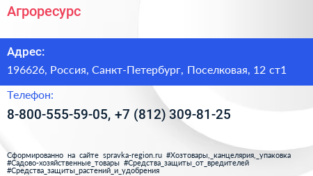 Агроресурс по адресу 196626, Россия, Санкт-Петербург, Поселковая, 12 ст1 в дальнейшем Организация, размещена в следующих категориях: