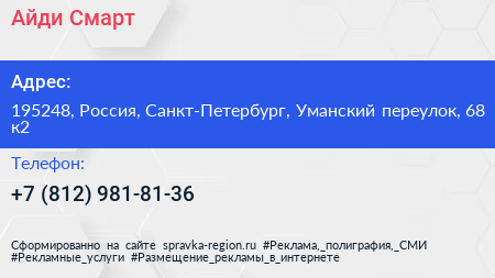 Айди Смарт по адресу 195248, Россия, Санкт-Петербург, Уманский переулок, 68 к2 в дальнейшем Организация, размещена в следующих категориях: