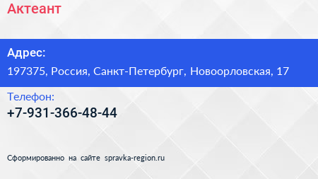 Актеант по адресу 197375, Россия, Санкт-Петербург, Новоорловская, 17 в дальнейшем Организация, размещена в следующих категориях:
